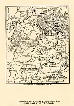 Allatoona was first founded in 1838.[2] Allatoona was also considered both an agricultural community and transportation crossroads established along Allatoona Creek at the southern end of the Appalachian Mountains. One of the first official buildings was a small post office that was active until 1918.[2] Before the Civil War, the town became increasingly popular, people started coming to the town in search of gold and other resources; a silver mine was also located nearby that also brought miners to the small town. The town also had a blacksmith, a small depot and a dry goods store.[2] A small Universalist church was built in 1910[2] which also functioned as a schoolhouse. The town later expanded and added a new schoolhouse site which would be located just a half mile southeast of the railroad that ran through town. John Clayton was among the first settlers to the town of Allatoona. He was a rich slave owner and owned several plantations around the area.[2] Several of the founders including John Clayton are buried in the cemetery adjacent to the church. The graves of founders and other residents can still be visited to this day.[2]