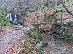 There are two small waterfalls to the west of Allensford on streams running south-to-north into the River Derwent. About 400m to the west on Allensford along a public footpath is Wharnley Burn Waterfall[10] on the Wharnley or Watergate Burn, pictured in this article. The footpath crosses a small bridge below the waterfall and continues south west into woodlands and eventually to farmland below Castleside.