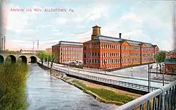 With industrialization, Allentown emerged as a major regional and national center for banking and finance. In 1860, William H. Ainey founded Allentown Savings and served as its first president. In 1864, Second National Bank of Allentown was formed, and Ainey was elected its first president, a position he held until his death. Ainey contributed to Allentown's industrial and retail growth, helping finance Iowa Barb Wire Company, which was later absorbed by American Steel & Wire, Pioneer Silk Factory, Palace Silk Mill, and Allentown Spinning Company.[24]
