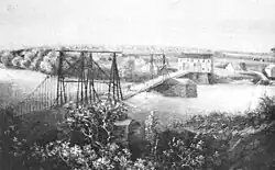 Throughout the early 1800s, the city grew primarily as a court and market town. Northampton Bank, the city's first bank located at the northeast corner of Center Square, was chartered in July 1814, and the first Hamilton Street Bridge, a 530 feet (160 m)-long chain structure, was constructed to cross Lehigh River in the city. The bridge featured two suspended lanes, one for east and one for westbound traffic, and a toll house at the bridge's western end.[16][23][24]