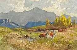 Glossop moved to Cape Colony in 1900, farming and painting first at Klapmuts in the Western Cape, and was an active member of the South African Society of Artists (SASA), serving on the Society's Council between 1902 and 1906.[2] She habitually transgressed the gender roles assigned to a single white woman in colonial South Africa by dressing in men's clothing (she was known to her close friends as "Joe"), wearing a pith helmet, smoking a pipe and venturing alone into rural areas to paint.[4] Between 1902 and 1917 she farmed in Wellington, Western Cape, and in 1917 moved to Johannesburg.[2]