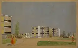 Two of Warner's most renowned buildings are the large and small 'Paintbox' (nl: Verfdos); two residential buildings in the Slotermeer area of Amsterdam.[4] At the time of their opening in 1956, the buildings created much interest nationally and internationally; more than 10,000 visitors came to see the buildings. Of particular interest was the colour scheme and deployment on the facade (designed by the Belgian artist Joseph Ongenae) and with long living rooms with windows at both ends that allowed sun to shine in the morning and afternoon.[5]