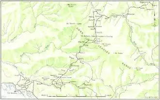 When the campaign began, the Kokoda Track started at McDonald's Corner, just beyond Ilolo. From there, the track slowly rose about 670 metres (2,200 ft) to what later became known as Owers' Corner.[99] The road from Port Moresby was sealed as far as Seven Mile, and from there a gravel surface was laid to provide an all-weather road as far as Sogeri, roughly 51 kilometres (32 mi) from Port Moresby.[100] On 24 June, GHQ queried whether it would be possible to upgrade the track to one that could handle animal transport or, better still, motor vehicles. There were multiple tracks leading to Kokoda, and in addition to the main track, there was interest at New Guinea Force HQ in a route along the Brown River that had been partially surveyed in 1912.[101]