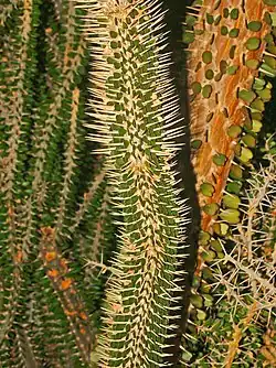 Alluaudia montagnacii can reach a height of 2.4–6 m (7 ft 10 in – 19 ft 8 in).[3] The tall columnar central trunk sprouts strong vertical branches. Stem and branches have symmetrically arranged leaves, about 1.5 cm (0.59 in) long, and black-tipped thorns, 2–2.5 cm (0.79–0.98 in) long. Leaves are deciduous in the long dry season. Photosynthesis is carried on by the stems. This plant is well adapted to live where water is a limiting environmental factor. The flowers are small, green or yellow.