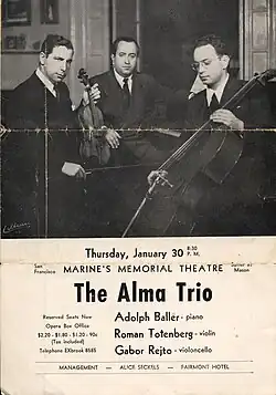 The original founding members of the Alma Trio were Roman Totenberg, violin; Gabor Rejto, cello; and Adolph Baller, piano. The members of the Trio had been encouraged by the famed artist, Yehudi Menuhin, to establish themselves as a professional piano trio. Adolph Baller had emigrated to the United States in 1938 with the sponsorship of Menuhin, following harrowing experiences at the hands of the Nazis in Austria and Germany. After arriving in the United States, Baller was a guest of Menuhin and became his regular collaborating pianist, as he had been earlier in Europe.