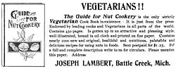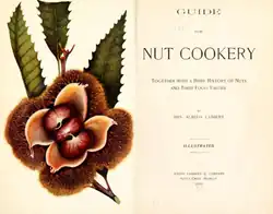 Lambert, a Seventh-day Adventist, published a Guide for Nut Cookery: Together with a Brief History of Nuts and Their Food Values in 1899.[8] Described as the first book in America focused exclusively on cooking with nuts,[9] it contains around 1,000 nut-based recipes, many of which had not been previously published.[10] Lambert states:[11]