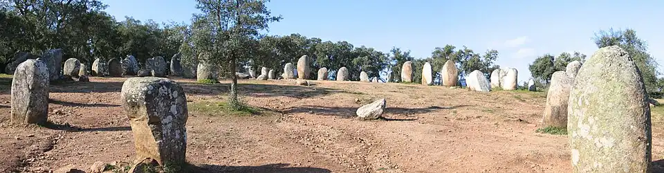 The Cromlech of the Almendres (Portuguese: Cromeleque dos Almendres/Cromeleque na Herdade dos Almendres) is a megalithic complex (commonly known as the Almendres Cromlech), located 4.5 road km WSW of the village of Nossa Senhora de Guadalupe, in the civil parish of Nossa Senhora da Tourega e Nossa Senhora de Guadalupe, municipality of Évora, in the Portuguese Alentejo. The largest existing group of structured menhirs in the Iberian Peninsula (and one of the largest in Europe), this archaeological site consists of several megalithic structures: cromlechs and menhir stones, that belong to the so-called "megalithic universe of Évora", with clear parallels to other cromlechs in Évora District, such as Portela Mogos and the Vale Maria do Meio Cromlech.[1]