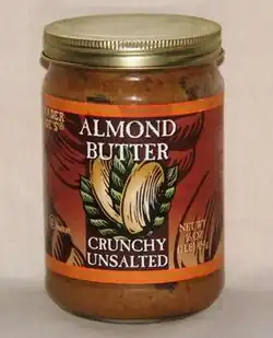 Almond butter is a food paste made from grinding almonds into a nut butter. Almond butter may be "crunchy" or "smooth", and is generally "stir" (susceptible to oil separation) or "no-stir" (emulsified). Almond butter may be either raw or roasted, but this describes the almonds themselves, prior to grinding.