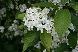 It has sometimes been placed in a separate genus of its own as Micromeles alnifolia, differing from other whitebeams in the deciduous sepals on the fruit (persistent in other whitebeams), but genetic evidence places it close to Sorbus aria.[5]