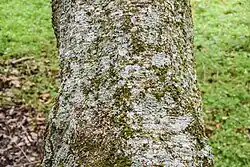 Alnus nepalensis is a large deciduous alder with silver-gray bark that reaches up to 30 m in height and 60 cm in diameter. The leaves are alternate, simple, shallowly toothed, with prominent veins parallel to each other, 7–16 cm long and 5–10 cm broad. The flowers are catkins, with the male and female flowers separate but produced on the same tree. The male flowers are 10 to 25 cm (4 to 10 in) long and pendulous, while the female flowers are erect, 1 to 2 cm (0.4 to 0.8 in), with up to eight together in axillary racemes.[2] Unusually for an alder, they are produced in the autumn, with the seeds maturing the following year.