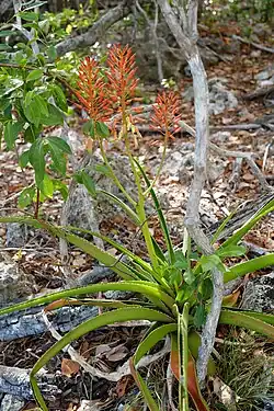 The Aldabra aloe usually grows singly, close to the ground, with at most a short stem. Its leaves are green with red or orange tints. Its multi-branched inflorescence bears orange-red flowers in racemes, and its seeds develop in fleshy berries.[3][4]