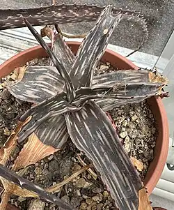Similar in leaf pattern to many aloes such as Aloe dijboutiensis, Aloe matucana, this aloe has white streaks on its leaves. This plant has white margins, with serrated edges.[2] This aloe does clump, but not majorly, usually 2-6 plants are in a clump. This plant's leaves are brown when sun stressed, and olive green if not. Leaves are in a "triangle" shape and grow in a rosette like other aloes.[3]