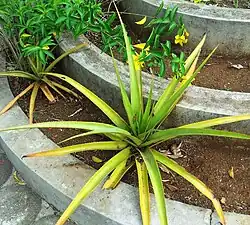 While the plants usually have slender, recurved, deeply concave leaves, the 1978 Flore des Mascareignes recorded that M.J.E. Coode collected a single extremely unusual plant, five years previously in 1973, near Yemen in western Mauritius. This plant had short, wide, compact, turgid leaves. It also bore unusually massive, robust, and multi-branched inflorescences, in spite of being quite small and acaulescent. The plant seemed to have a different internal structure too, and its leaves produced large amounts of an unusual yellow gel when cut open.