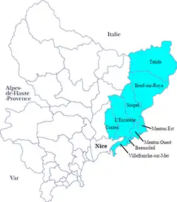 | Cantons | Beausoleil, Breil-sur-Roya, L'Escarène, Menton-Est, Menton-Ouest, Sospel, Tende, Villefranche-sur-Mer |