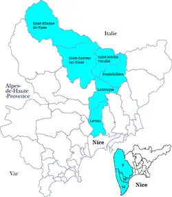 | Cantons | Contes, Guillaumes, Lantosque, Levens, Nice-9, Nice-14, Puget-Théniers, Roquebillière, Roquestéron, Saint-Étienne-de-Tinée, Saint-Martin-Vésubie, Saint-Sauveur-sur-Tinée, Villars-sur-Var |