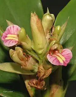 Alpinia hylandii is a plant in the ginger family Zingiberaceae endemic to Queensland, Australia. It is a herbaceous shrub which grows to about 1 m high, and like many other gingers the true stems are underground and only the branches appear above ground. It has glossy leaves up to 16 cm long by 2.5 cm wide. Colourful pink and yellow flowers are produced in clusters at the ends of the branches, and are followed by globose, blue, capsular fruit containing numerous seeds.[4]