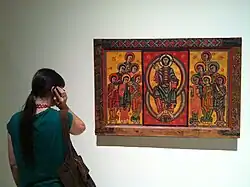 The Altar frontal from La Seu d'Urgell or of The Apostles is a Romanesque altar frontal currently exhibited at the National Art Museum of Catalonia, Barcelona, Spain.[1] The work dates from the second quarter of the 12th century and comes from a church of the Bishop of La Seu d'Urgell and was acquired in 1905. It is one of the masterpieces of the collection of panel painting of the MNAC. The frontal, the item covering the front of the altar, stands out for the quality of its bright colours and because it illustrates some of the characteristics of composition in Romanesque art, such as bilateral symmetry, abstraction of the background, with no reference to space or context, and the unnatural geometrical treatment of form to be observed in the folds of the clothing. It also shows certain conventions of representation, such as so-called hierarchical perspective, which consists in representing the chief character in a larger size.[2]