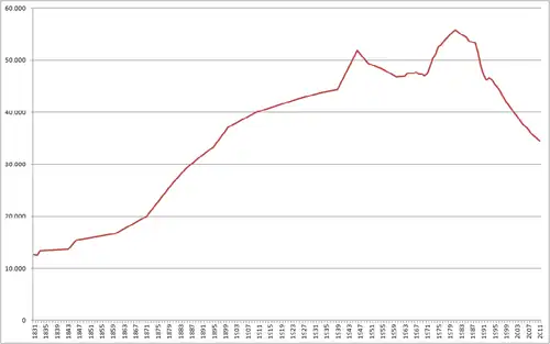 Altenburg has been a relatively big town (compared to others in the wider region) down the centuries, because of its importance as a Kaiserpfalz and later as a ducal residence. During the Middle Ages, it had a population of 3,000 to 4,000 inhabitants, rising to 6,000 around 1700, 10,000 around 1800 and 20,000 around 1870, making it Thuringia's second-largest city after Erfurt for a short time in the mid-19th century. The population grew further to 40,000 in 1910, 44,000 in 1940 and peaked at about 56,000 around 1980 before starting to decline. In 1988, before reunification, Altenburg had 53,000 inhabitants, shrinking to 41,000 by 2000 and 33,000 in 2012. With a decline of nearly 40% since 1988, Altenburg is among the most rapidly declining urban areas in Germany.