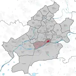 Location of the Altstadt (red) and the Ortsbezirk Innenstadt I (light red) within Frankfurt am Main | |