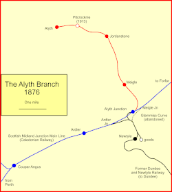 The Alyth Railway was a short branch railway line built in Strathmore in Scotland, connecting the town of Alyth to the main line network. It opened in 1861. Its junction was remote from any large population centre except Dundee, which was only reached by a primitive line with three rope worked inclines. This was modernised in 1868 and the Alyth branch, now with a good connection to Dundee, became busy. Nonetheless, the population of Alyth declined, and so did usage of the line, and it closed in 1951.