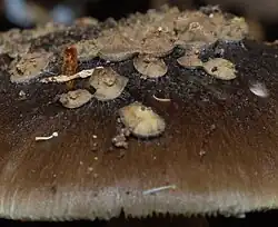 The cap of A. nothofagi is initially convex, later becoming flattened with a central depression, with radial grooves on the margin, reaching diameters of 3–13 centimetres (1–5 inches). The colour is variable, ranging from buff to dark grey to greyish-sepia, with radial streaks of dusky brownish grey. The cap surface is sticky when young or wet, but dries out with age. The remnants of the volva form small to large, irregularly shaped, felted patches, that are dull greyish-sepia to sepia, and sometimes scab-like. The gills are crowded closely together, and free from attachment to the stem. They are white to cream-coloured, 6–10 mm (1⁄4–3⁄8 in) wide. The lamellulae (short gills that do not extend fully from the cap edge to the stem) have somewhat truncated ends.[4]