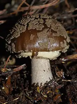 Amanita nothofagi is a species of fungus in the family Amanitaceae. Endemic to New Zealand, the species was first described by mycologist Greta Stevenson in 1962. The fruit bodies have dark brown caps that are up to 13 cm (5.1 in) in diameter and covered with patches of soft greyish-brown scales or warts. The gills underneath the cap are crowded together, free from attachment to the stem, and white, becoming tinged with yellow in age. The stem of the mushroom is 4–14 cm (1.6–5.5 in) long by 0.5–2.5 cm (0.2–1.0 in) thick, and has a ring. The spore print is white, and individual spores are spherical to ellipsoid, measuring 7.5–9 by 7.5–9 micrometres. The mushroom may be confused with another New Zealand species, A. australis, but can be distinguished by certain characteristics. Amanita nothofagi is a mycorrhizal species, and grows in association with native New Zealand trees such as southern beech.