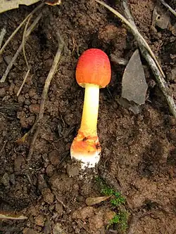 A. rubrovoltata mushrooms grow in groups on the ground. Amanita species form mycorrhizal relationships with trees. This is a mutually beneficial relationship where the hyphae of the fungus grow around the roots of trees, enabling the fungus to receive moisture, protection and nutritive byproducts of the tree, and affording the tree greater access to soil nutrients.[17] The original Japanese collections were made in forests dominated by Japanese beech (Fagus crenata),[3] but it has also been found growing near Quercus luecotrichophora, Rhododendron arboreum, and Myrica esculenta in India,[13] in Castanopsis-Schima forest in Nepal,[18] and in Castanopsis indica plantations in the Himalayas.[18]