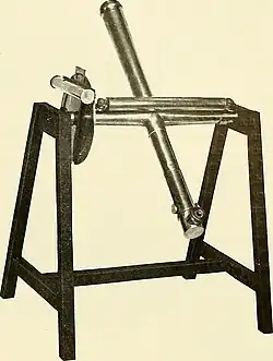 - Transit telescope, refractor, twenty-one inches (530 mm) in length and mounted on a fourteen-inch (360 mm) cross tube with a graduated marked circle, but missing the base.