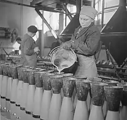 Amatol is a highly explosive material made from a mixture of TNT and ammonium nitrate.[1] The British name originates from the words ammonium and toluene (the precursor of TNT). Similar mixtures (one part dinitronaphthalene and seven parts ammonium nitrate) were known as Schneiderite in France. Amatol was used extensively during World War I and World War II, typically as an explosive in military weapons such as aircraft bombs, shells, depth charges, and naval mines.[2] It was eventually replaced with alternative explosives such as Composition B, Torpex, and Tritonal.