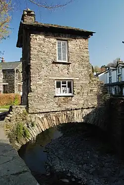 Bridge House was built over Stock Ghyll more than 300 years ago, probably as a summer house and apple store for Ambleside Hall. It was purchased by local people in 1926 and given to the National Trust. Listed Grade I, the building is now used as an information centre for the National Trust, and is part of the Trust's Windermere and Troutbeck property.[11][12]