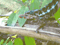 Many ambush predators actively attract their prey towards them before ambushing them. This strategy is called aggressive mimicry, using the false promise of nourishment to lure prey. The alligator snapping turtle is a well-camouflaged ambush predator. Its tongue bears a conspicuous pink extension that resembles a worm and can be wriggled around;[17] fish that try to eat the "worm" are themselves eaten by the turtle. Similarly, some reptiles such as Elaphe rat snakes employ caudal luring (tail luring) to entice small vertebrates into striking range.[18]