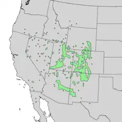 The core mountainous range of the species is delimited by the Colorado–New Mexico–Wyoming Rocky Mountains[3] in the east, the Front ranges of Utah at the west, and the Mogollon Rim and White Mountains region of central-east Arizona and western New Mexico to the south.[3]