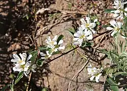 In mid-spring the shrub blooms short inflorescences of white flowers, each with five widely spaced, 1-cm-long, narrow petals.[2] The fruits are 1-cm-long purplish pomes.[2]