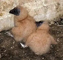 The black vulture lays its eggs on the ground in a wooded area, a hollow log, or some other cavity, seldom more than 3 m (10 ft) above the ground.[34] While it generally does not use any nesting materials, it may decorate the area around the nest with bits of brightly colored plastic, shards of glass, or metal items such as bottle caps.[45] Clutch size is generally two eggs, though this can vary from one to three. The egg is oval and, on average, measures 7.56 cm × 5.09 cm (2.98 in × 2.00 in). The smooth, gray-green, bluish, or white shell is variably blotched or spotted with lavender or pale brown around the larger end.[45] Both parents incubate the eggs, which hatch after 28 to 41 days.[45] Upon hatching, the young are covered with a buffy down, unlike turkey vulture chicks which are white.[51] Both parents feed the nestlings, regurgitating food at the nest site. The young remain in the nest for two months, and after 75 to 80 days, they can fly skillfully.[47] Predation of black vultures is relatively unlikely, though eggs and nestlings are readily eaten if found by mammalian predators such as raccoons, coatis and foxes. Due to its aggressiveness and size, few predators can threaten the fully-grown vulture. However, various eagles may kill vultures in conflicts, and even the ornate hawk-eagle, a slightly smaller bird than the vulture, has preyed on adult black vultures, as well as the two eagles native to North America (north of Mexico).[32][52][53]