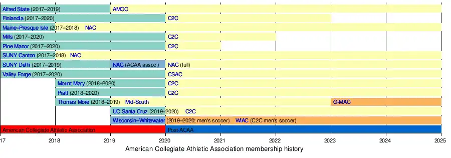 - 2019 - The University of Wisconsin–Whitewater joined the ACAA as an affiliate member for men's soccer, effective in the 2019 fall season (2019-20 academic year).