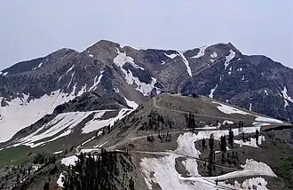 The Twin Peaks are a set of mountain high points located on the Alpine Ridge within the Wasatch Range in Utah, United States, on the border between Salt Lake and Utah County. They are usually referred to as the American Fork Twin Peaks, to distinguish them from the nearby Broads Fork Twin Peaks and Avenues Twin Peaks. Consisting of several sub-peaks, only one has the prominence to be considered a true summit. The summit has an elevation of 11,461 feet (3,493 m),[1] making it the highest point in Salt Lake County. The peak is also the most prominent in Salt Lake County, and one of the most prominent in the Wasatch Range.