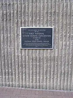In the spring of 1832, Lewis Tappan and William Green rented the building. They offered it to the Presbyterian minister Charles Grandison Finney, a radical abolitionist who converted it into the Free Presbyterian Chatham Street Chapel. In October 1832, the chapel was the site of the first national Sunday School convention in the United States. Over the next ten years, at first here, then from 1835 to 1836 at the massive new Broadway Tabernacle,[15] Finney gave sermons each Sunday to crowds as large as 3000[16] and led revivals three times a week.[17] The Sacred Music Society, a popular religious choir, rented the building for two nights a week in this period at a cost of $850 a year.[16] Philip Hone described his reaction to a performance in 1835:
