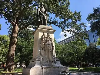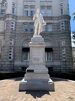 Clark Mills was commissioned to create an equestrian statue of George Washington, the country's first president and commander-in-chief of the Continental Army. The equestrian statue was installed in 1860 in Washington Circle, the first of the 14 American Revolutionary statuary to be erected in Washington, D.C.[2] The next statue of a Revolutionary War hero was in honor of Major General Nathanael Greene, erected in 1878 in Stanton Park and designed by Henry Kirke Brown.[4] It is considered one of the city's best equestrian statues.[5][6] The third statue, depicting Benjamin Franklin in a standing pose, was sculpted by Jacques Jouvenal and installed in 1889. It was later moved to its current location in front of the Old Post Office.[7] Franklin's statue is one of four of the statues not paid for by the U.S. government. It was a donation from Stilson Hutchins, founder of The Washington Post.[7] The fourth statue installed, sculpted by Alexandre Falguière and Antonin Mercié, was in honor of Major General Gilbert du Motier, Marquis de Lafayette, one of two French military figures to be honored in Lafayette Square. It was erected in 1891.[8] The park had been named after him during his 1824 visit to the U.S.[5]