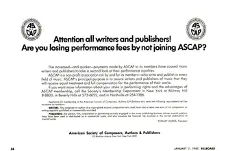 ASCAP's membership diversified further in the 1940s, bringing along jazz and swing greats.[16] In the 1940s, it was common for ASCAP and BMI to send out field representatives to sign new songwriters and music publishing companies, as the firms were not household names; one such ASCAP employee was Loring Buzzell, who later formed the music publishing company Hecht-Lancaster & Buzzell Music.[17][18]