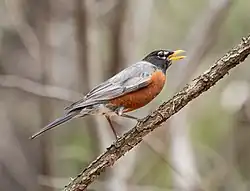 Juveniles and eggs are preyed upon by squirrels, snakes, and some birds.[17] Adults are primarily taken by Accipiter hawks, cats, and larger snakes such as rat snakes and gopher snakes.[31][32] Canids such as foxes[33] and dogs take fledglings from the ground. Raccoons often prey upon nests, while small agile carnivores such as American martens,[34] ring-tailed cats[35] and long-tailed weasels hunt adults.[36][37] The greatest predatory impact is probably from raptorial birds.[38][39] 28 raptorial bird species hunt American robins.[40][41] Adult robins are most vulnerable while breeding activities, whereas feeding flocks are vigilant for predators.[17]