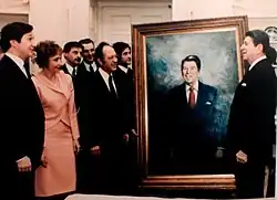 In 1982, Americo Makk was commissioned to paint a portrait of President Ronald Reagan, while Eva Makk was commissioned to paint Nancy Reagan.[46][47] Americo created two original portrait studies of the President that were previewed at the Nelson Rockefeller Collection in Palm Springs and were the forerunners to the final painting.[48][49][3] On March 5, 1983, the Rockefeller Gallery held a reception presenting the early paintings of the President by Americo Makk as part of its West Coast premiere in Palm Springs.[50] Americo Makk expressed his concerns with painting the portrait in an interview for The Desert Sun, that if a president did not appreciate his portrait then the artist faced public scrutiny, referencing President Lyndon B. Johnson's portrait painted by respected landscape artist Peter Hurd.[51] Americo, with Eva and A.B., personally presented the 60-inch by 40-inch painting to President Reagan in the oval office of the White House on March 29, 1984, with the American Hungarian Federation.[52][53] Two additional portraits were also presented to the first family. Americo painted President Reagan with the Space Shuttle in the background. Eva Makk painted a portrait of the President and Nancy Reagan together, which was 60 inches by 40 inches.[52] An article in the Hawaiian periodical Artists in Paradise said of President Reagan's portrait that its "imagery, execution and technique reflect the spirit of our modern times with their sudden changes in political alignments, their looming national conflicts, their rapid advances in technology, and the need for decisive leadership and prompt action if we are to survive as a nation ... Makk's portrait dramatizes the soul and significance of a strong American President."[44]