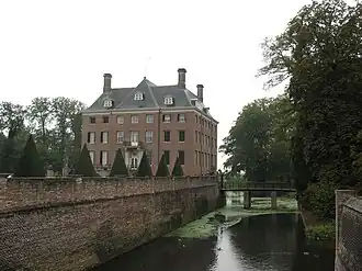 The current building was designed by the architect Maurits Post as a baroque palace for the owners Godard Adriaan van Reede and his wife Margaretha Turnor. In the main hall a central staircase with painted ceiling was built by Willem van Nimwegen.[1] Other ornaments were added in the early 20th century by P.J.H. Cuypers.[1] The gardens contain historical elements and the walls predate 1673.[1] Near the entrance bridge dating from 1678 is a wooden clock tower from 1728 that contains the original clock of the same date.[1] In the northeast corner of the gardens is an orangerie dating from the 1880s; the north wall was raised during the period when Wilhelm II was residing there 1918–1920.[1] He abdicated in Amerongen then moved to Huis Doorn.