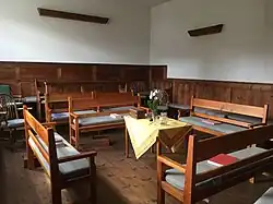 It was extended and refronted in red brick in the late 18th century. The meeting room is divided into two by a wooden screen with shutters. A large burial ground is situated to the north and west of the house.[1]