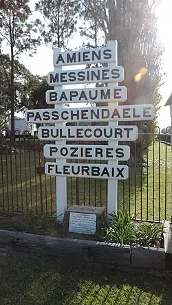 Construction of a 20-kilometre railway line west of Cottonvale to the village of Amiens was authorised in 1919 to assist returned soldiers who had been granted land in the region. The Amiens branch was designed to serve an agricultural area developed for the settlement of returned servicemen after the First World War. For this reason, all the stations along the line were named after battlegrounds on the Western Front – Fleurbaix, Pozieres, Bullecourt, Passchendaele, Bapaume and Messines. The line was not built to convey passengers but rather to transport fruit from the soldiers' orchards to markets in Brisbane and Sydney.[1]