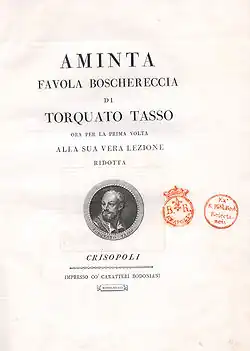 Aminta is a play written by Torquato Tasso in 1573, represented during a garden party at the court of Ferrara. Both the actors and the public were noble persons living at the Court, who could understand subtle allusions the poet made to that style of life, in contrast with the life of shepherds, represented in an idyllic way.