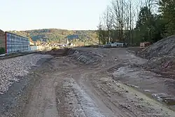 According to 2012 figures (at 2006 prices), the estimated cost of the duplication of the two sections (4 km in total), the electrification of the whole line (including the Schlossberg tunnel) and the construction of a new main platform amounted to €27.8m.[8] In the Hardtwald area, the swampy subsoil caused problems, so the foundations of the existing track had to be rebuilt.[9] For the construction work, the former track 3 in Altingen also had to be temporarily rebuilt as a construction track.[10] This is to be put into permanent operation as a siding without a platform, so the halt will thus be reclassified as a full station again.[11][12][13]