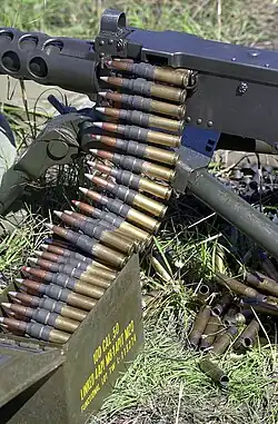 A belt of 0.50 caliber ammunition loaded into an M2 Browning. Every fifth round (red tip) is an M20 (armor piercing incendiary tracer).