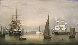Hudson River School paintings that reflect the influence of Luminism are also found in the Carter collection. These include works by Sanford Robinson Gifford (1823–1880), Martin Johnson Heade (1819–1904), John Frederick Kensett (1816–1872), and Fitz Henry Lane (1804–1865). Given its "dark, brooding mystery," the painting by Heade, Thunder Storm on Narragansett Bay (1868), is considered by many observers to be the artist's masterpiece.[15]