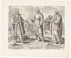 The Hebrew Bible records that Amon continued his father Manasseh's practice of idolatry and set up pagan images as his father had done.[3] II Kings states that Amon "did that which was evil in the sight of Yahweh, as did Manasseh his father. And he walked in all the way that his father walked in, and served the idols that his father served, and worshipped them."[7] Similarly, II Chronicles records that "…he did that which was evil in the sight of the Lord, as did Manasseh his father; and Amon sacrificed unto all the graven images which Manasseh his father had made, and served them."[10] The Talmudic tradition recounts that "Amon burnt the Torah, and allowed spider webs to cover the altar [through complete disuse] ... Amon sinned very much."[11][12] Like other textual sources, Flavius Josephus too criticizes the reign of Amon, describing his reign in similar terms to the biblical accounts.[13]