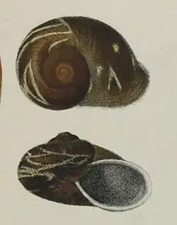 (Original description in Latin) The shell, characterized by its thinness and depressed-globose form, is moderately umbilicate. Its surface is minutely granulate in subserial rows and sculpted with very oblique growth lines. The shell's coloration is brownish-olive, sparsely marked with opaque milky-white flashes. It consists of four rapidly increasing, convex whorls. The body whorl is large, somewhat inflated, and descends anteriorly. The spire is slightly prominent, terminating in an obtuse apex. The aperture is large, transverse, and slightly oblique, positioned nearly subhorizontally, with a lilac interior. The peristome is white, shortly expanded, and reflexed. Its margins are approximate, and the columellar edge is oblique, rather straight, and barely arched. [2]